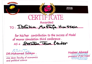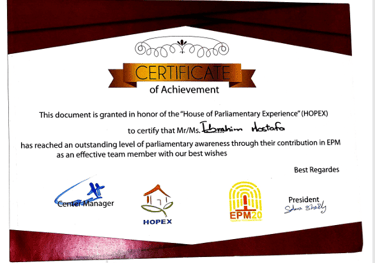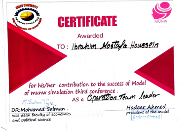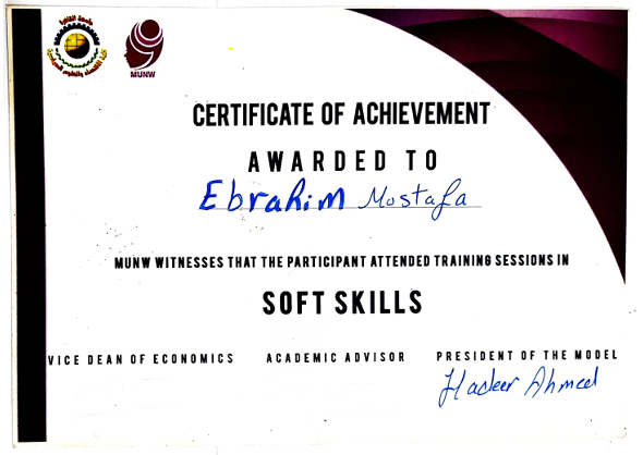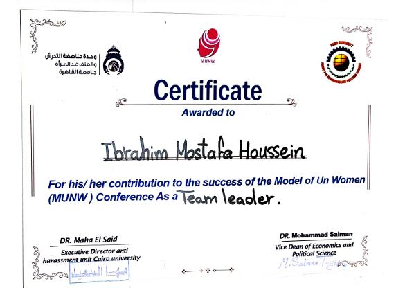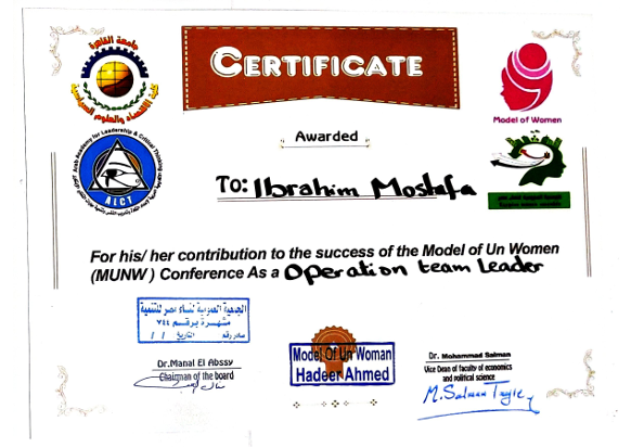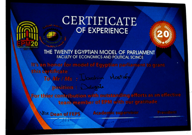 Recognized as a member of the 20th Egyptian Model Parliament and honored for contributing impactful local improvement recommendations to the Parliament Minister.