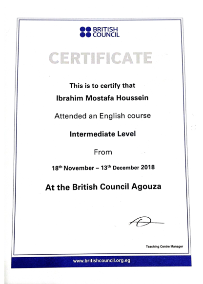 I have been certified from the British Council Agouza for attending the Intermediate levels course.